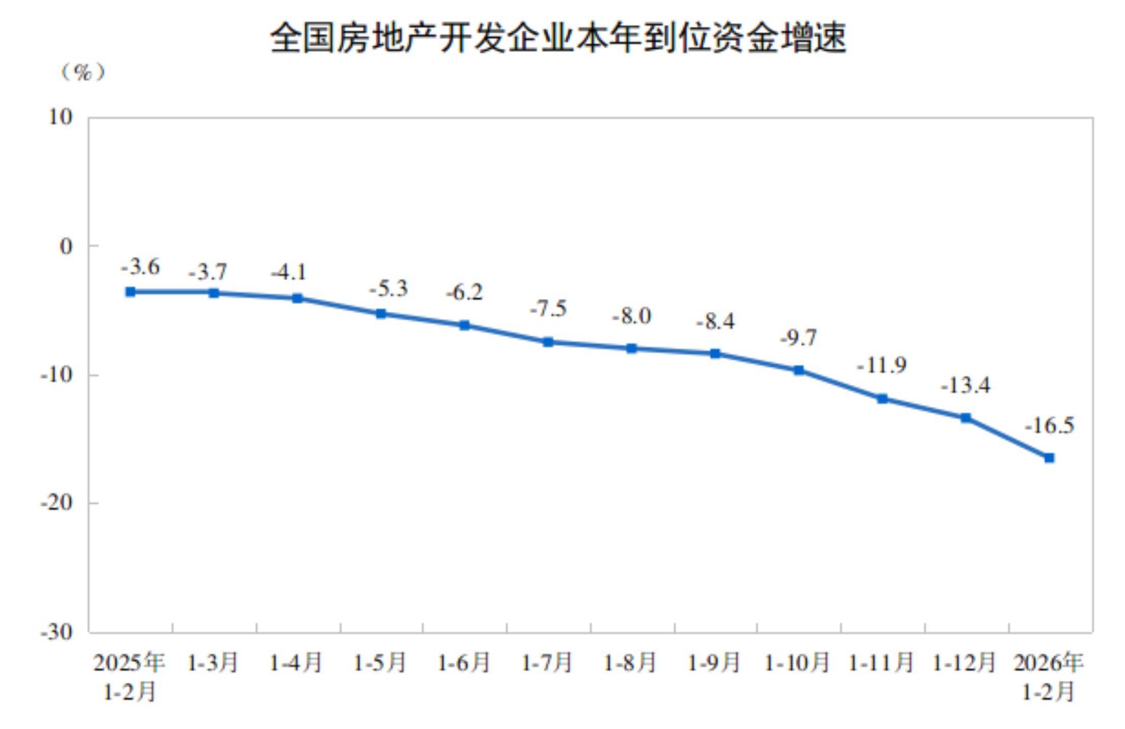 1—2月份,房地产开发企业到位资金13047亿元,同比下降16.5%。其中,国内贷款2570亿元,下降13.9%;自筹资金4939亿元,下降5.9%;定金及预收款3589亿元,下降21.5%;个人按揭贷款1128亿元,下降41.9%。