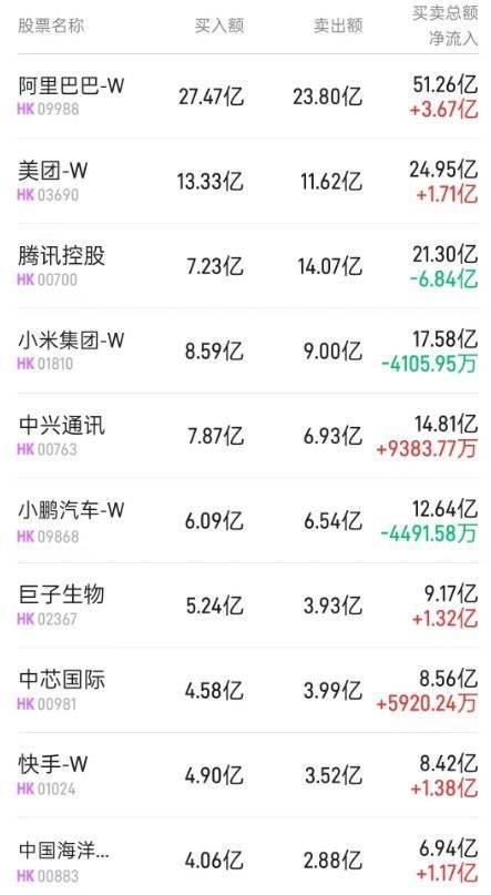 北水净买入最多的个股是美团-W(03690)、小米集团-W(01810)、 阿里巴巴-W(09988)。北水净卖出最多的个股是腾讯(00700)、中芯国际(00981)、中国人寿(02628)。